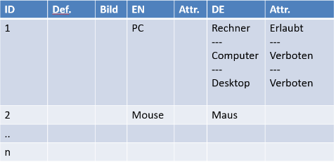 Hier gibt es eine feste Anzahl von Spalten und nur eine Zeile pro Begriff. Wenn in einer Sprache mehrere Benennungen zu einem Begriff gehören, werden sie in derselben Zelle geschrieben und durch einen Strich getrennt.